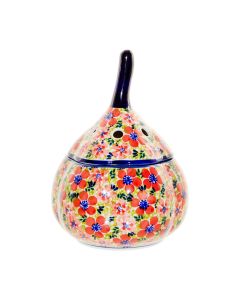 Dekoration DU-205Dies ist eine der einzigartigen Dekorationen, die sich durch eine größere Vielfalt an Mustern und Farben als bei traditionellen Dekorationen auszeichnen. Hier ist das reiche Muster, das in verschiedenen Grün- und Rottönen mit kleinen Kobaltbeimischungen gehalten ist, auf der gesamten Oberfläche des Gefäßes aufgetragen. Eine Blumenwiese, ein Garten? Betrachten Sie diese Tischdekoration, wie Sie wollen.