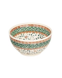 D-1096 decorationThe pottery with this decoration are certainly not boring. Their colours refer to the traditional Bolesławiec decorations, in which we have cobalt, green and brown. However here it is not cobalt but brown that plays the first fiddle. There are lines in three shades of green and brown, lines in these colours running around the pottery. The whole is complemented by cobalt spots, in which it is difficult to see any order. The background resembles spotted birds' eggs. One can fall in love.