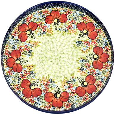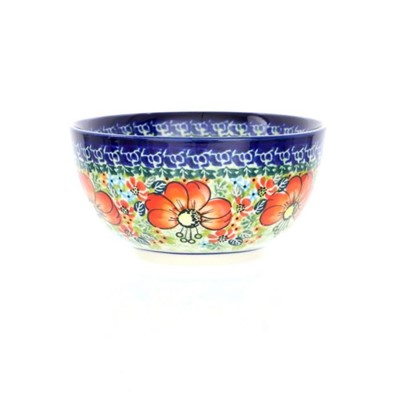 The stunning hand-painted depiction of poppies on Polish pottery will leave you in awe. These vibrant red flowers with yellow centers and visible stamens come alive on the pottery's surface. It's easy to be amazed by their boldness and beauty.