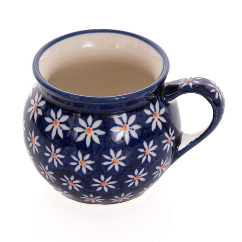 Crafted to keep drinks warm, the mug's material composition is top-notch. It's versatile, too. You can safely place it in your dishwasher, microwave, or refrigerator. And the design? It's a classic Boleslawiec. Tiny flowers decorate the exterior, their blue petals and bright orange centers standing out against the creamy white backdrop.