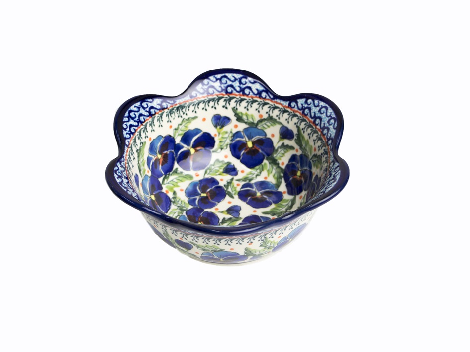 This unique bowl has the shape of a blooming flower. It's adorned with Poland's pansies, a plant known for its striking beauty.
