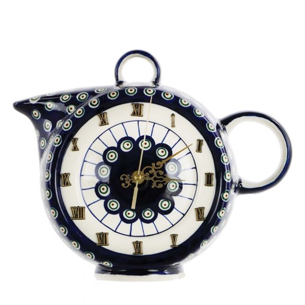 The Clock Teapot, handcrafted by Zakłady Ceramiczne "BOLESŁAWIEC" artists, showcases the beloved "Peacock's Eye" design in all its glory. The design features circles filled with intricate cobalt, green, and brown dots, reminiscent of a peacock's stunning tail feathers.