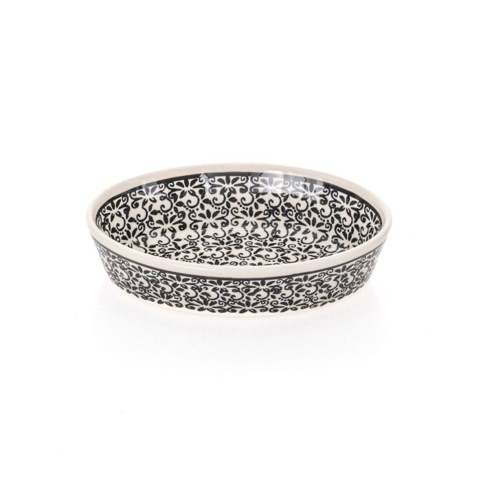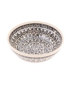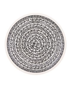 • Like all ceramic products from Zakłady Ceramiczne "BOLESŁAWIEC", the platters are hand-decorated using stamps and brushes, making each one unique, so there may be minimal differences in decoration between individual pieces within the same designD-941 decorationIn the case of this decoration, almost the whole surface of the pottery is covered with a densely stamped plant motif. We can see here flowers, leaves, twisted moustaches of creepers. The multitude of shapes contrasts with minimalism of colours - the whole decoration is black, and it is applied on a piece of pottery in a cream shade. This is definitely a very elegant decoration.