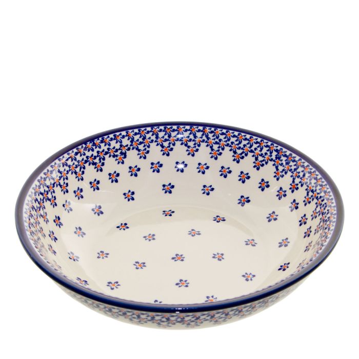 Bowl (V1,3L)A-882A decorationBeautiful, subtle floral pattern in cobalt and orange colors. Tiny flowers on the ceramics join together in groups, and then single flowers break away from the floral veil giving an interesting effect on the surface of the pottery. This decoration is for the lovers of more modern and simpler patterns from Bolesławiec.