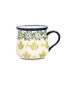 A-1058A decorationA touch of spring, a touch of summer - decorations in shades of green are not common in Bolesławiec ceramics. In this decoration we have a cobalt rim, below it a floral relief in dark green, somewhat reminiscent of sea waves, the next circle is delicate green leaves - slightly maple- or ivy-like - and then again a plant relief. The decoration is enriched with small flowers with red petals.