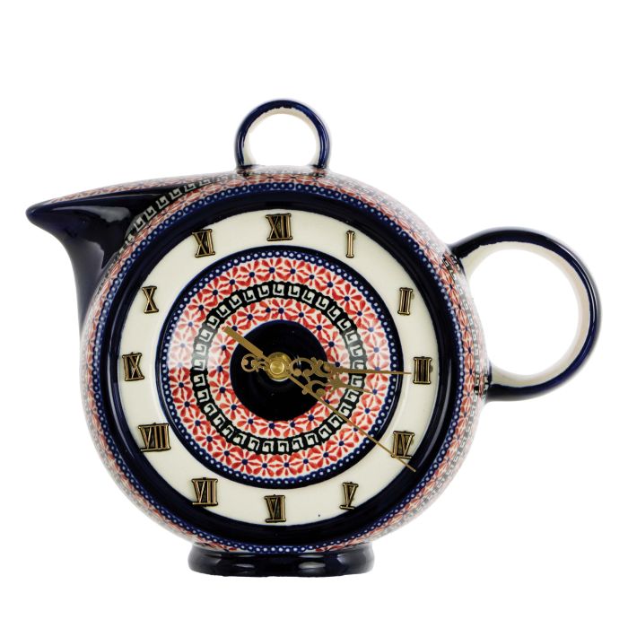 Clock "teapot" h:25,3cm 10,6x31,5cmART-149 decorationThis is one of the unique decorations, which are characterized by a greater variety of patterns and colors than traditional decorations. In this case we have a motif of a flower meadow or a garden with butterflies flying over it, attracted by the flowers. The colours used are: cobalt, red, orange, shades of green, blue and brown. A contrast to the truly painterly floral motif are stencils composed of abstract patterns. Very spectacular decoration.