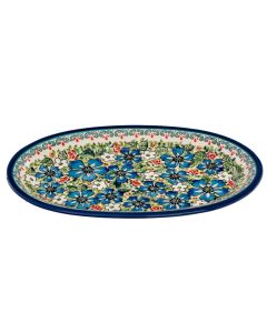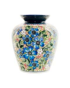 Decoration EX-308 "clematis"It is an example of exclusive decoration, with artistic character, very painterly. The whole surface of the pottery is covered with a floral pattern, dominated by large blue flowers, which resemble Clematis, so popular in gardens, or Hibiscus, more and more popular here. Why not bring your favorite flowers to the table in the form of the pottery, especially since this bouquet also includes roses, strawberry blossoms, and strawberries. The contrast for the garden bursting with colors is made by thick cobalt lines and colorful patterns. The decoration makes your heart beat faster.