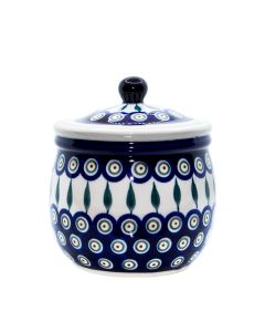 D-56 decorationOne of the oldest and most classic decorations from the "BOLESŁAWIEC" Ceramic Works combines stamps in the characteristic "peacock eye" pattern with hand-painted leaves. The stamping method is a traditional technique for decorating dishes dating back to 1882, when local potters invented a decoration made using a sponge with underglaze paints in intense cobalt blue and green colors. Despite many years passing, this form of decoration remains consistently popular among contemporary enthusiasts of Bolesławiec pottery.