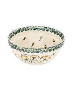 • Like the entire product range of Zakłady Ceramiczne "BOLESŁAWIEC", the bowls are also hand-decorated using stamps and brushes, making each one unique, so minimal differences in decoration may occur between individual pieces of the same pattern.DU-201 decorationIt is one of the unique decorations, which are characterized by a greater variety of patterns and colors than the traditional ones. The demanding lovers of Bolesławiec pottery will notice flowers here, but can they be identified as some species from our gardens or are they like plants from a dream? They are neither dandelions nor mimosa. What do you associate them with?