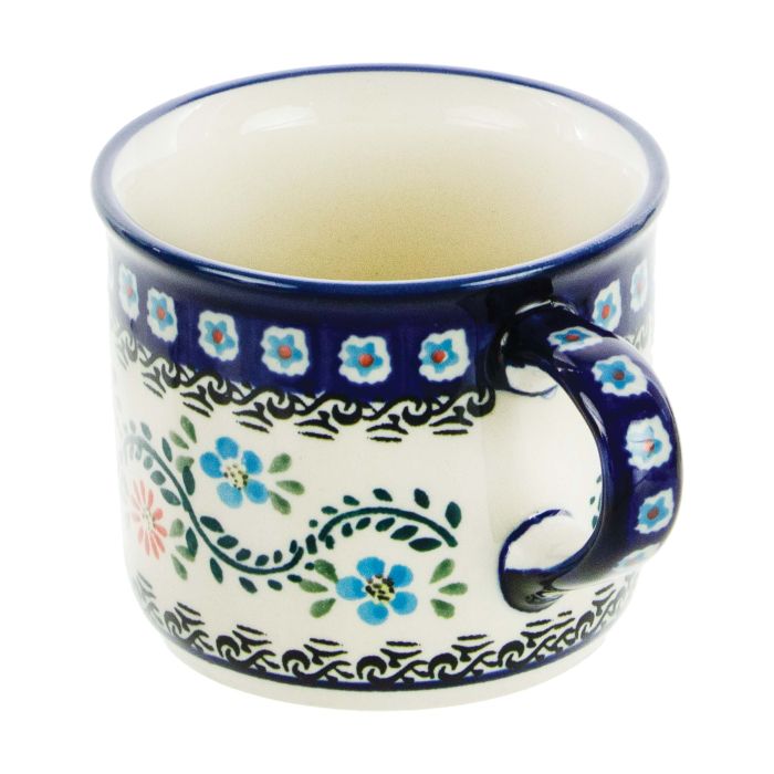 • Like every piece of tableware from Ceramic Workshops "BOLESŁAWIEC", the mugs are also hand-decorated using stamps and brushes, making each one unique. Therefore, slight differences in decoration between individual specimens of the same decoration are possible.A-1145A „Forget-Me-Not” decoration The decoration of elevated standard in shades of cobalt presents itself remarkably impressively. The delicate floral motif adorning this decoration gives it a unique charm and elegance. The decoration's creator has invested a lot of effort and attention to detail, evident in every centimeter of its surface. As a result, this decoration becomes not only an aesthetic element but also an expression of artistic dedication and the creator's passion. Decoration creator – Danuta Amborska
