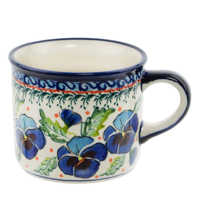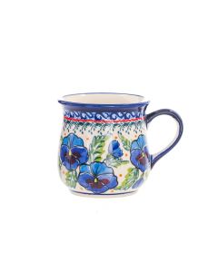 • Like every piece of tableware from Ceramic Workshops "BOLESŁAWIEC", the mugs are also hand-decorated using stamps and brushes, making each one unique. Therefore, slight differences in decoration between individual specimens of the same decoration are possible.ART-277 "pansies" decorationThis is one of the unique decorations, which are characterized by a greater variety of patterns and colors than traditional decorations. In this case, we have one of the most beautiful Polish flowers, namely pansies. Maintained in the colors of dark blue with black centers are elegant. A contrast to the truly painterly floral motif are the scrawls composed of abstract patterns. Unusual decoration for the connoisseurs of Bolesławiec pottery.