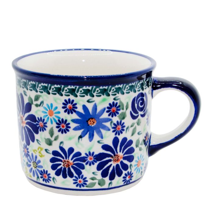 • Like every piece of tableware from Ceramic Workshops "BOLESŁAWIEC", the mugs are also hand-decorated using stamps and brushes, making each one unique. Therefore, slight differences in decoration between individual specimens of the same decoration are possible.DU-126 decorationThis is one of the unique decorations that have a greater variety of patterns and colors than traditional decorations. We have four shades of green, cobalt, shades of blue. The decoration brings to mind a summer meadow, where there is no lack of shapes and colours. This richness is held in check by cobalt lines on the edges. It is impossible to look away.