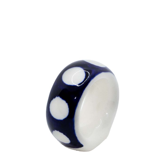 Napkin RingD-26 decorationCobalt and cream background is always a perfect combination of colors, found on ceramics for decades. This decoration is simple, classic, although it cannot be said that it clearly refers to the tradition of Bolesławiec. Peas? Colic? Dots? Call it what you want, but be sure to check how the tea tastes in a cup with such a motif. All the decorations of the dishes, manufactured in Zakłady Ceramiczne "BOLESŁAWIEC", are made by hand painters using traditional methods - using stamps and brushes. After the stage of decorating and glazing, the dishes are subjected to a second firing at high temperature, thanks to which both the dish and the decoration gain resistance to damage and color change. Each hand-decorated item is one-of-a-kind, as minor variations in decoration are inevitable.