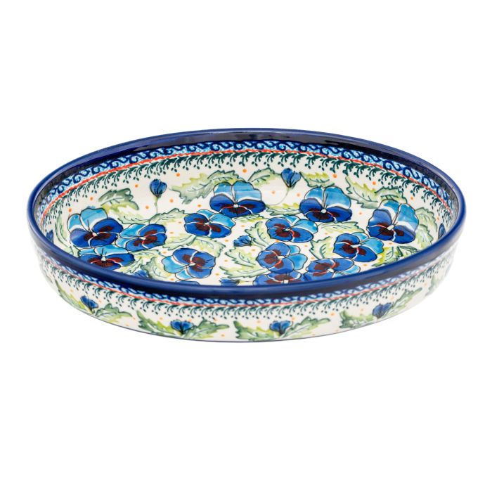 • Like all Bolesławiec dishes, it is decorated by hand using brushes and stamps, glazed and fired at high temperatures, making it resistant to damage, and the decoration color will remain unchanged. The platter's decoration can easily be matched to other Bolesławiec dishes or you can start with it and complete the rest of the set in the same decorationART-277 "pansies" decorationThis is one of the unique decorations, which are characterized by a greater variety of patterns and colors than traditional decorations. In this case, we have one of the most beautiful Polish flowers, namely pansies. Maintained in the colors of dark blue with black centers are elegant. A contrast to the truly painterly floral motif are the scrawls composed of abstract patterns. Unusual decoration for the connoisseurs of Bolesławiec pottery.