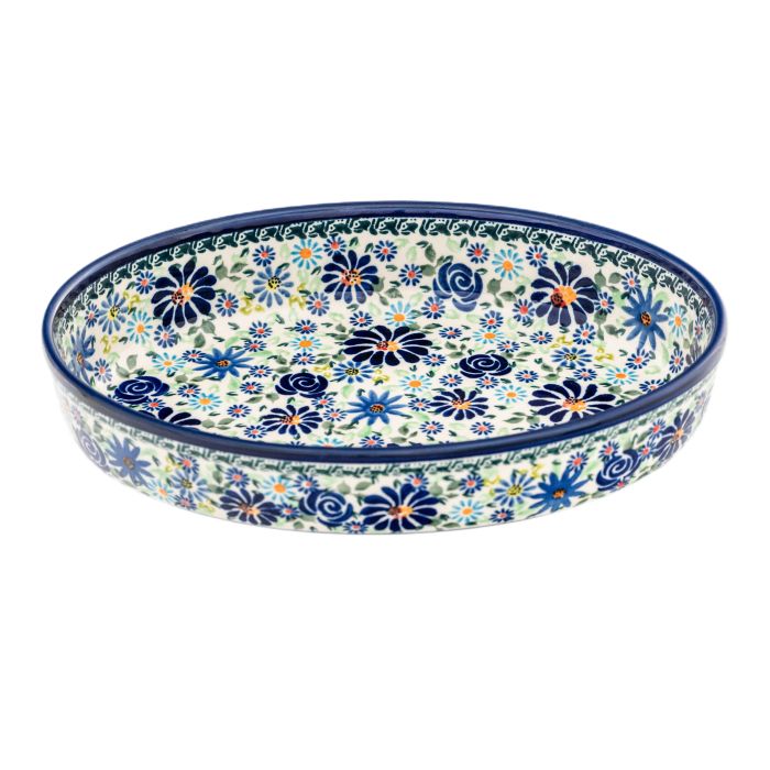 • Like all Bolesławiec dishes, it is decorated by hand using brushes and stamps, glazed and fired at high temperatures, making it resistant to damage, and the decoration color will remain unchanged. The platter's decoration can easily be matched to other Bolesławiec dishes or you can start with it and complete the rest of the set in the same decorationDU-126 decorationThis is one of the unique decorations that have a greater variety of patterns and colors than traditional decorations. We have four shades of green, cobalt, shades of blue. The decoration brings to mind a summer meadow, where there is no lack of shapes and colours. This richness is held in check by cobalt lines on the edges. It is impossible to look away.