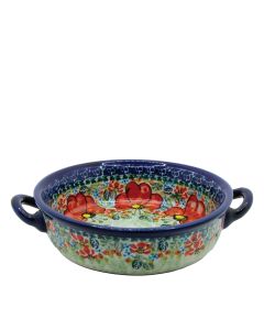 • Like all ceramic products from Zakłady Ceramiczne "BOLESŁAWIEC", the platters are hand-decorated using stamps and brushes, making each platter unique, so there may be minimal differences in decoration between individual pieces within the same decorationART-296 "poppies" decorationThis is one of the unique decorations, which are characterized by a greater variety of patterns and colors than traditional decorations. Here the red colour dominates in two scenes - large flowers with yellow centres and visible stamens, and clouds of flowers around them in blue, red, orange and green. The rich decoration covers the whole surface of the pottery. The contrast to its exuberant painterliness is a cobalt thick line and a scattering of abstract patterns.
