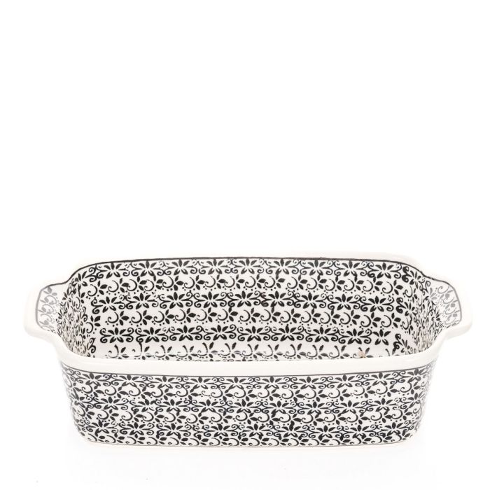 • Like all ceramic products from Zakłady Ceramiczne "BOLESŁAWIEC", the platters are hand-decorated using stamps and brushes, making each platter unique, so there may be minimal differences in decoration between individual pieces within the same decorationD-941 decorationIn the case of this decoration, almost the whole surface of the pottery is covered with a densely stamped plant motif. We can see here flowers, leaves, twisted moustaches of creepers. The multitude of shapes contrasts with minimalism of colours - the whole decoration is black, and it is applied on a piece of pottery in a cream shade. This is definitely a very elegant decoration.