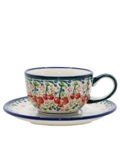 The rich crimson hues of the cherry design are complemented by delicate green foliage details, bringing a natural vibrancy to any table setting.