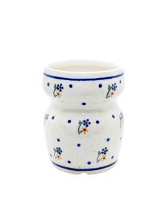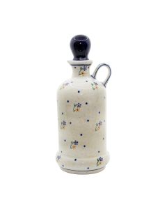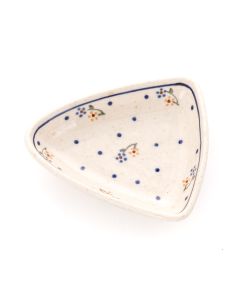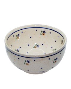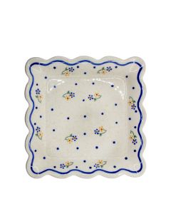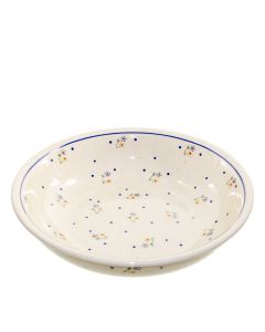 The composition is further enhanced by scattered navy blue dots that create rhythm and movement across the surface, balancing the symmetrical arrangement of the main floral elements.