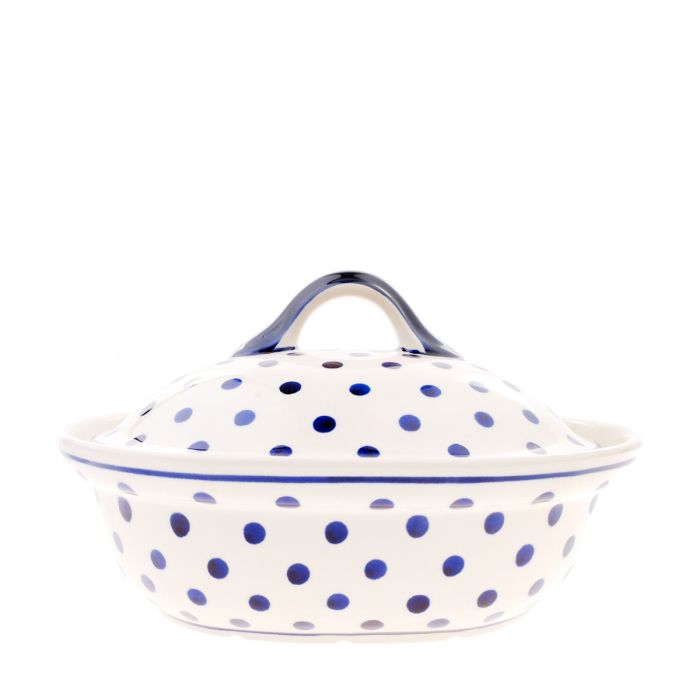 • Like the whole product range of Zakłady Ceramiczne "BOLESŁAWIEC", the roasters are also decorated manually with stamps and brushes, thanks to which each one is unique, and therefore minimal differences in decoration may occur between particular pieces within the same decorationD-37 decorationCobalt and a cream background is always a perfect colour combination, found on the pottery for decades. This decoration is simple, classic, although it can't be said to unequivocally refer to the tradition of Bolesławiec. Peas? Circles? Spots? Call it what you like, but be sure to check how tea tastes in a cup with such a motif.