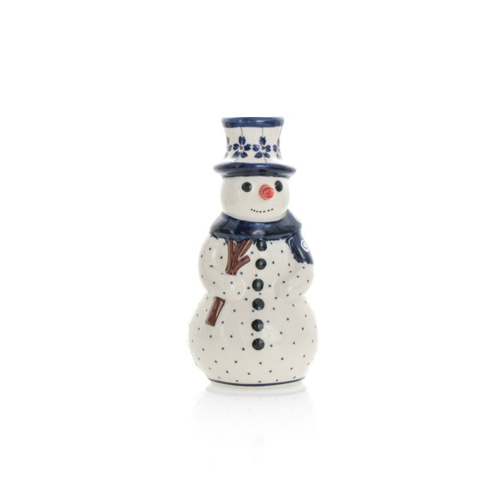 Snowman Statuette A-166A decorationThis decoration is the queen among decorations - admired and loved by customers. The idea for it is based on the classic Bolesławiec decorations, where we have three colours: cobalt, brown and green. There are also cobalt, tightly arranged circles with peacock eyes merging into a cobalt cloud. They are separated by a garland of flowers with slightly ragged petals that are a bit reminiscent of the bearded carnations from our grandmothers' and mothers' gardens.