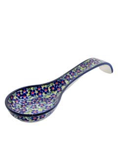 DU-206 decorationIt is one of the unique decorations, characterised by a greater variety of patterns and colours than in case of traditional decorations. Cobalt, so characteristic for the Bolesławiec pottery, dominates here. This time in the form of small flowers with five petals. Between them, there are leaves in various shades of green. Classic ceramic elegance in a floral edition.