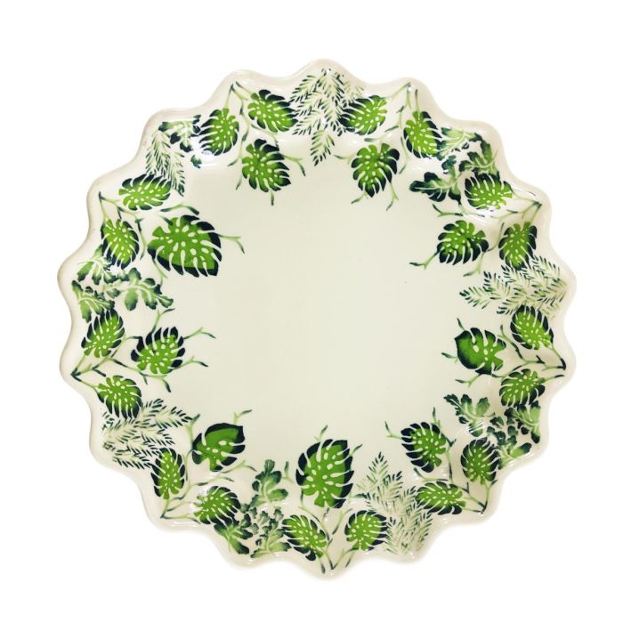 D-1308 "monstera" decorationThe motif of monstera leaves has been one of the most popular decorative motifs in interiors for several seasons. The appearance of monstera on the Bolesławiec pottery is a sign that one can move with the times and successfully combine tradition with modernity. The decoration consists of monstera leaves in juicy green and leaves of other plants in various shades of this colour. All this on a cream background. It is unpretentious and fashionable.