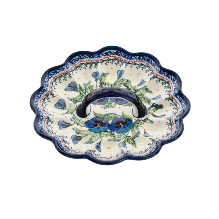ART-277 "pansies" decorationThis is one of the unique decorations, which are characterized by a greater variety of patterns and colors than traditional decorations. In this case, we have one of the most beautiful Polish flowers, namely pansies. Maintained in the colors of dark blue with black centers are elegant. A contrast to the truly painterly floral motif are the scrawls composed of abstract patterns. Unusual decoration for the connoisseurs of Bolesławiec pottery.