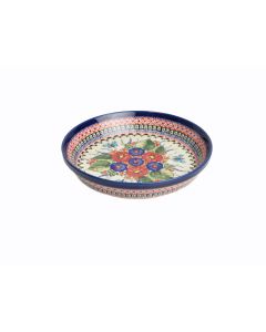 • Jak cały asortyment Zakładów Ceramicznych „BOLESŁAWIEC”, także brytfanny dekorowane są ręcznie przy użyciu stempli i pędzli, dzięki czemu każda jest jedyna w swoim rodzaju, a zatem mogą wystąpić minimalne różnice w zdobieniu pomiędzy poszczególnymi egzemplarzami w ramach jednej dekoracjiART-149To jedna z unikatowych dekoracji, które charakteryzują się większą różnorodnością wzorów i kolorów niż tradycyjne dekoracje. W tym przypadku mamy motyw łąki kwiatowej lub ogrodu, po którym latają motyle przyciągnięte przez kwiaty. Użyte kolory to: kobalt, czerwony, pomarańczowy, odcienie zieleni, niebieski i brązowy. W kontraście do prawdziwie malarskiego motywu kwiatowego są szablony składające się z abstrakcyjnych wzorów. Bardzo spektakularna dekoracja.