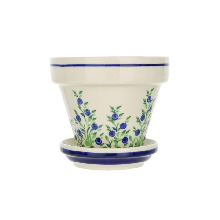• Podobnie jak cała oferta Zakładów Ceramicznych „BOLESŁAWIEC”, także i donice zdobione są ręcznie przy użyciu stempli i pędzli, dzięki czemu każda z nich jest niepowtarzalna, w związku z czym pomiędzy poszczególnymi egzemplarzami w ramach tej samej dekoracji mogą wystąpić minimalne różnice w zdobnictwieD-1208Motyw jagód na ceramice Bolesławiec to jedna z nowszych dekoracji, która zdobyła serca naszych klientów. Jej design nawiązuje do klasycznych kolorów - mamy jagody w kolorze kobaltu oraz liście i łodygi w zieleni. Na naczyniach udekorowanych w ten sposób dominuje kremowe tło, dzięki czemu są one optycznie lekkie. Jagody wywołują pozytywne skojarzenia z latem i słońcem, ale będą świetnym dodatkiem do stołu w każdej porze roku.