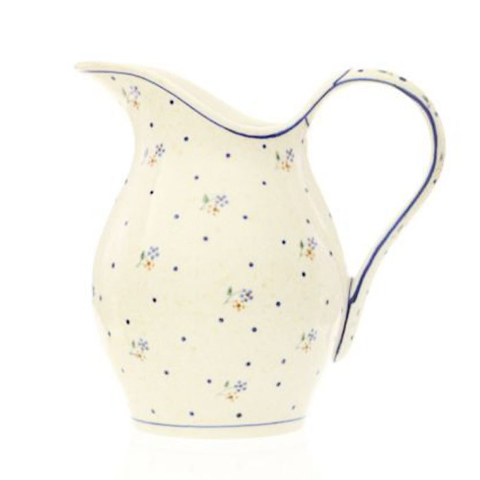 • Podobnie jak cała oferta Zakładów Ceramicznych „BOLESŁAWIEC”, również dzbany zdobione są ręcznie przy użyciu stempli i pędzli, dzięki czemu każdy z nich jest niepowtarzalny, dlatego też pomiędzy poszczególnymi egzemplarzami w ramach tej samej dekoracji mogą wystąpić minimalne różnice w zdobnictwieD-111Charakterystycznym elementem wzoru jest delikatna gałązka z kwiatkami. Na zielonych gałązkach z listkiem są dwa drobne, geometryczne kwiatki: żółty i niebieski, każdy z brązowym środkiem. Element rozłożony jest symetrycznie na żółtym, marmurkowym tle. Dopełnieniem są drobne, granatowe kropki, rozrzucone luźno pomiędzy kwiatkami. To jedna z naszych ponadczasowych dekoracji.