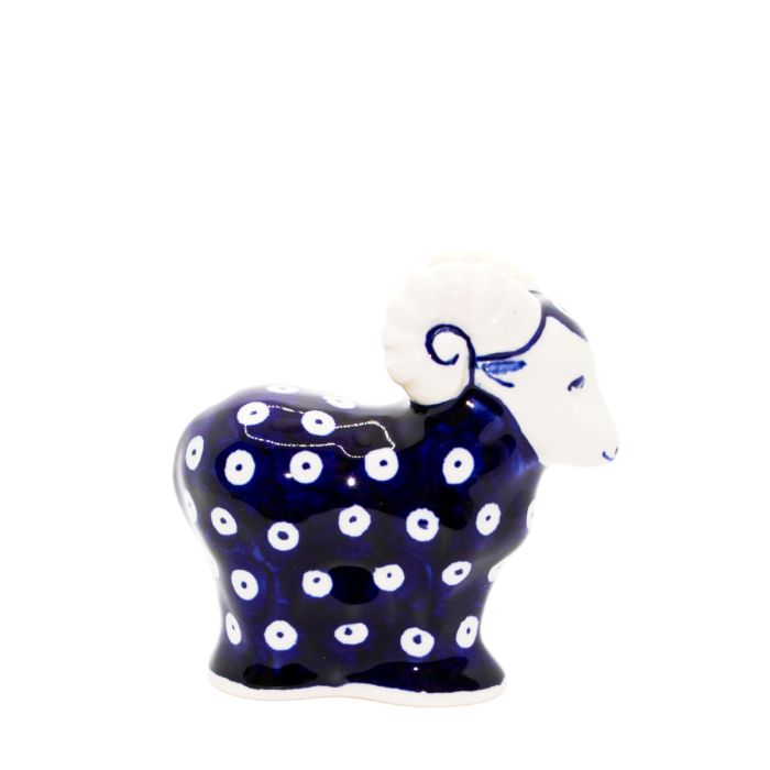 Figurka Baranek D-42To jedna z najbardziej klasycznych i jednocześnie bardzo popularnych dekoracji w ceramice Bolesławca. Do wyboru są tu kobaltowe koła z białym środkiem i kobaltową kropką, przechodzące w kobaltową chmurę. Białe koła są gęsto i przypadkowo rozmieszczone. Wydają się uporządkowane, a jednak trochę przypadkowe. Barwy używane do dekoracji czynią ją minimalistyczną i elegancką.