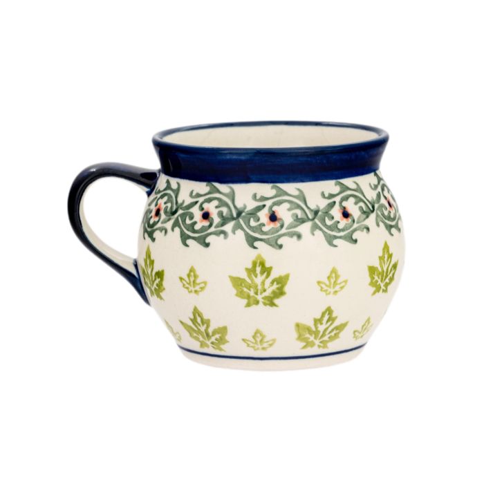 Kubek Beczułka duży (V0,5L)• Ceramiczny kubek „beczułka duży” o pojemności 0,5 litra • Kubek swoim kształtem nawiązuje do tradycyjnej śląskiej szolki • Dzięki masie, z której został wykonany i charakterystycznemu kształtowi kubek długo utrzymuje temperaturę gorących napojów • To zdecydowanie propozycja dla wielbicieli dużych kubków, kandydat na ulubiony kubek do herbaty wszystkich domowników • Kubek można myć w zmywarce, używać w kuchenkach mikrofalowych oraz przechowywać w nim żywność w lodówce • Dzięki szkliwieniu i wypałowi w wysokiej temperaturze dekoracja kubka odporna jest na zniszczenie • Jak każde naczynie z Zakładów Ceramicznych „BOLESŁAWIEC”, także kubki dekorowane są ręcznie przy użyciu stempli i pędzli, co sprawia, że każdy jest jedyny w swoim rodzaju, a zatem możliwe są niewielkie różnice w zdobieniu pomiędzy poszczególnymi egzemplarzami w ramach jednej dekoracjiA-1058ANutka wiosny, odrobina lata - dekoracje w odcieniach zieleni nie są częste w ceramice Bolesławca. W tej dekoracji mamy kobaltowy brzeg, poniżej niego relief kwiatowy w ciemnej zieleni, nieco przypominający fale morza, następny pierścień to delikatne zielone liście - nieco przypominające liście klonu lub bluszczu - a następnie ponownie relief roślinny. Dekoracja jest wzbogacona o małe kwiatki o czerwonych płatkach.