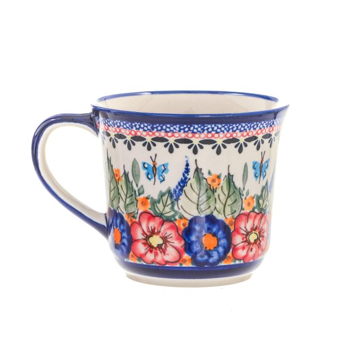 • Podobnie jak cała oferta produktów Zakładów Ceramicznych "BOLESŁAWIEC", kubki są także dekorowane ręcznie, przy użyciu stempli i pędzli, co sprawia, że każdy z nich jest wyjątkowy, dlatego też możliwe są niewielkie różnice w dekoracji między poszczególnymi egzemplarzami w ramach tej samej dekoracji.ART-149To jedna z unikatowych dekoracji, które charakteryzują się większą różnorodnością wzorów i kolorów niż tradycyjne dekoracje. W tym przypadku mamy motyw łąki kwiatowej lub ogrodu, po którym latają motyle przyciągnięte przez kwiaty. Użyte kolory to: kobalt, czerwony, pomarańczowy, odcienie zieleni, niebieski i brązowy. W kontraście do prawdziwie malarskiego motywu kwiatowego są szablony składające się z abstrakcyjnych wzorów. Bardzo spektakularna dekoracja.
