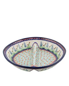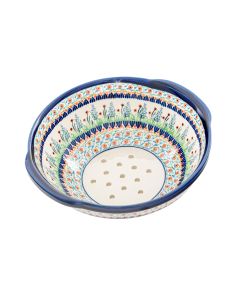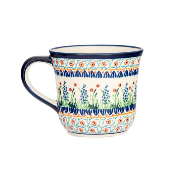 • Podobnie jak cała oferta produktów Zakładów Ceramicznych "BOLESŁAWIEC", kubki są także dekorowane ręcznie, przy użyciu stempli i pędzli, co sprawia, że każdy z nich jest wyjątkowy, dlatego też możliwe są niewielkie różnice w dekoracji między poszczególnymi egzemplarzami w ramach tej samej dekoracji.DU-155To jedna z unikatowych dekoracji, charakteryzujących się większą różnorodnością wzorów i kolorów niż tradycyjne motywy. Tutaj mamy motyw kwiatowy, florystyczny. Trzy rodzaje kwiatów, liście, trawa. Układ pokazuje, że bardziej przypomina ogród niż łąkę. Szczególnie że widzimy szałwii i "przeszkody" starannie stemplowanych abstrakcyjnych wzorów. Nie brakuje również kolorów: jest kobalt, zieleń, błękit, czerwień, żółty. Ceramika z taką dekoracją stanowi piękną dekorację stołu.