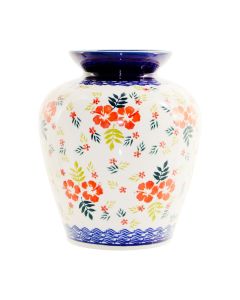 Kubek podróżny (V0,3L)Nadaje się zarówno do gorących jak i zimnych napojów. Dołączona w zestawie silikonowa pokrywka zapobiega rozlewaniu i stygnięciu napoju. Antypoślizgowy uchwyt odporny na wysokie temperatury pozwala swobodnie używać kubka do picia dowolnego napoju. Można go używać w kuchence mikrofalowej oraz myć w zmywarce.A-1306AEgzotyczny, pomarańczowo-czerwony kwiat hibiskusa i soczyste, zielone liście na bolesławieckiej ceramice? Dlaczego nie? Oceńcie sami, jak ten motyw zdobniczy zaproponowany przez projektantkę Barbarę Morżkowską-Michalak prezentuje się na ceramicznych naczyniach. Naszym zdaniem całkiem nieźle! P.S. Jest też kobaltowy szlaczek - chyba coś dla Was tradycjonaliści!