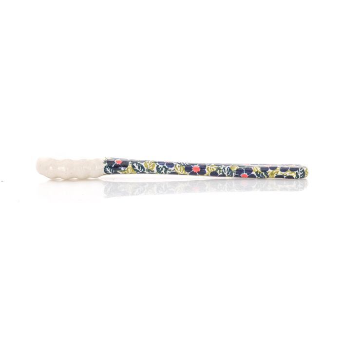 • Podobnie jak cała oferta Zakładów Ceramicznych „BOLESŁAWIEC”, również łyżki do miodu zdobione są ręcznie przy użyciu stempli i pędzli, dzięki czemu każda z nich jest niepowtarzalna, dlatego też pomiędzy poszczególnymi egzemplarzami w ramach jednej dekoracji mogą wystąpić minimalne różnice w zdobnictwieDU-206To jedna z unikatowych dekoracji, charakteryzujących się większą różnorodnością wzorów i kolorów niż w przypadku tradycyjnych dekoracji. Kobalt, tak charakterystyczny dla ceramiki bolesławieckiej, dominuje tutaj. Tym razem w formie małych kwiatów z pięcioma płatkami. Między nimi znajdują się liście w różnych odcieniach zieleni. Klasyczna ceramiczna elegancja w edycji kwiatowej.