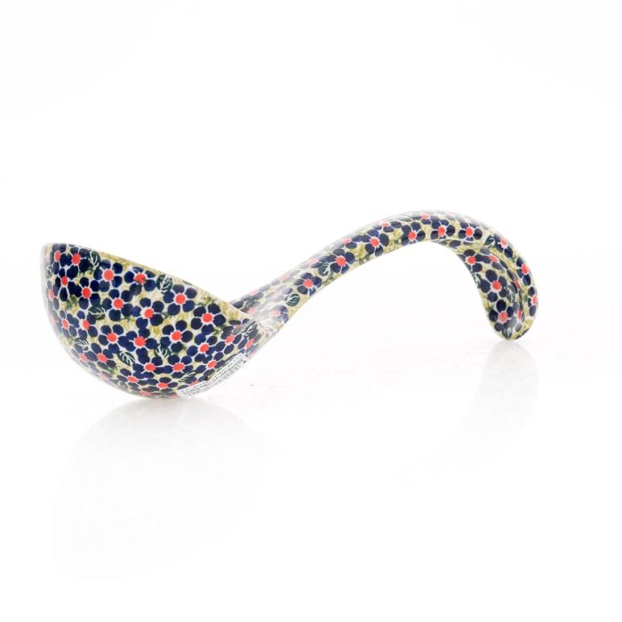Łyżka wazowaDU-206To jedna z unikatowych dekoracji, charakteryzujących się większą różnorodnością wzorów i kolorów niż w przypadku tradycyjnych dekoracji. Kobalt, tak charakterystyczny dla ceramiki bolesławieckiej, dominuje tutaj. Tym razem w formie małych kwiatów z pięcioma płatkami. Między nimi znajdują się liście w różnych odcieniach zieleni. Klasyczna ceramiczna elegancja w edycji kwiatowej.