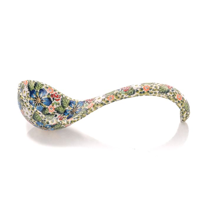 Łyżka wazowaEX-308To przykład ekskluzywnej dekoracji o charakterze artystycznym, bardzo malarskim. Cała powierzchnia ceramiki jest pokryta wzorem kwiatowym, dominowanym przez duże niebieskie kwiaty, które przypominają Klejnotki, tak popularne w ogrodach, lub hibiskus, coraz bardziej popularny tutaj. Dlaczego więc nie przynieść ulubionych kwiatów na stół w formie ceramiki, zwłaszcza że ten bukiet zawiera również róże, kwiaty truskawek i truskawki. Kontrastem dla ogrodu pełnego kolorów są grube linie kobaltu i kolorowe wzory. Dekoracja przyspiesza bicie serca.