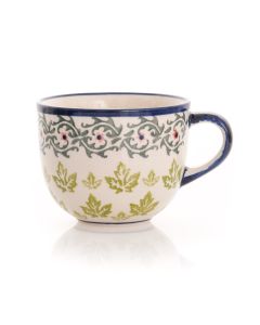 • Jak wszystkie ceramiki z Zakładów Ceramicznych "BOLESŁAWIEC", pojemniki na masło są również ręcznie dekorowane za pomocą stempli i pędzli, dzięki czemu każdy jest unikatowy, dlatego mogą występować minimalne różnice w dekoracji między poszczególnymi egzemplarzami w ramach tej samej dekoracjiA-1058ANutka wiosny, odrobina lata - dekoracje w odcieniach zieleni nie są częste w ceramice Bolesławca. W tej dekoracji mamy kobaltowy brzeg, poniżej niego relief kwiatowy w ciemnej zieleni, nieco przypominający fale morza, następny pierścień to delikatne zielone liście - nieco przypominające liście klonu lub bluszczu - a następnie ponownie relief roślinny. Dekoracja jest wzbogacona o małe kwiatki o czerwonych płatkach.