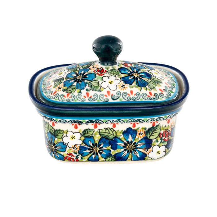Maselnica z pokrywąEX-308To przykład ekskluzywnej dekoracji o charakterze artystycznym, bardzo malarskim. Cała powierzchnia ceramiki jest pokryta wzorem kwiatowym, dominowanym przez duże niebieskie kwiaty, które przypominają Klejnotki, tak popularne w ogrodach, lub hibiskus, coraz bardziej popularny tutaj. Dlaczego więc nie przynieść ulubionych kwiatów na stół w formie ceramiki, zwłaszcza że ten bukiet zawiera również róże, kwiaty truskawek i truskawki. Kontrastem dla ogrodu pełnego kolorów są grube linie kobaltu i kolorowe wzory. Dekoracja przyspiesza bicie serca.