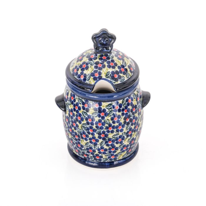 Miodownik (V0,6L) DU-206To jedna z unikatowych dekoracji, charakteryzujących się większą różnorodnością wzorów i kolorów niż w przypadku tradycyjnych dekoracji. Kobalt, tak charakterystyczny dla ceramiki bolesławieckiej, dominuje tutaj. Tym razem w formie małych kwiatów z pięcioma płatkami. Między nimi znajdują się liście w różnych odcieniach zieleni. Klasyczna ceramiczna elegancja w edycji kwiatowej.