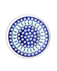 D-56Jedna z najstarszych i najbardziej klasycznych dekoracji Zakładów Ceramicznych „BOLESŁAWIEC” łącząca stemple w charakterystycznym wzorze „pawiego oczka” z ręcznie malowanymi listkami. Metoda stempelkowa to tradycyjna technika zdobienia naczyń sięgająca 1882 roku, kiedy to miejscowi garncarze wynaleźli dekorację wykonywaną za pomocą gąbki z użyciem farb podszkliwnych w intensywnych barwach kobaltu i zieleni. Mimo upływu wielu lat ta forma zdobienia pozostaje niezmiennie popularna wśród współczesnych miłośników ceramiki bolesławieckiej.
