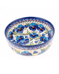 ART-277To jedna z unikatowych dekoracji, które charakteryzują się większą różnorodnością wzorów i kolorów niż tradycyjne dekoracje. W tym przypadku mamy do czynienia z jednym z najpiękniejszych polskich kwiatów, czyli bratkami. Zachowane w kolorach ciemnego niebieskiego z czarnymi środkami są eleganckie. W kontraście do prawdziwie malarskiego motywu kwiatowego są szkice składające się z abstrakcyjnych wzorów. Nietypowa dekoracja dla koneserów ceramiki Bolesławca.