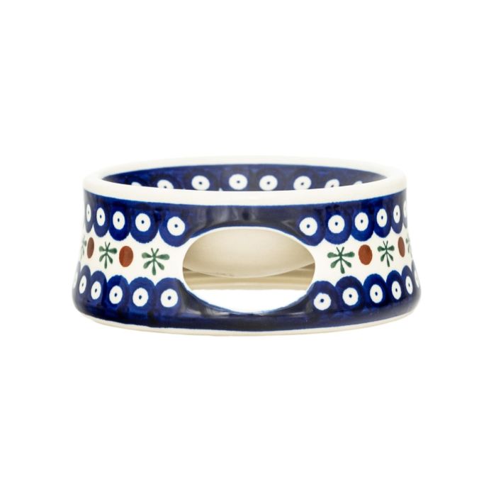 Miska dla psa lub kota D-41To jedna z klasycznych dekoracji ceramicznych z Bolesławca, na której oczy pawie kiedyś były głównym motywem dekoracyjnym. Mamy tu niebieskie koła z białymi środkami z niebieskimi kropkami pośrodku, których brzegi łączą się w niebieski obłok. Dodażka zieleni i brązu - kolejne tradycyjne kolory dekoracji - sprawiają, że dekoracja staje się optycznie jaśniejsza i bardziej interesująca.