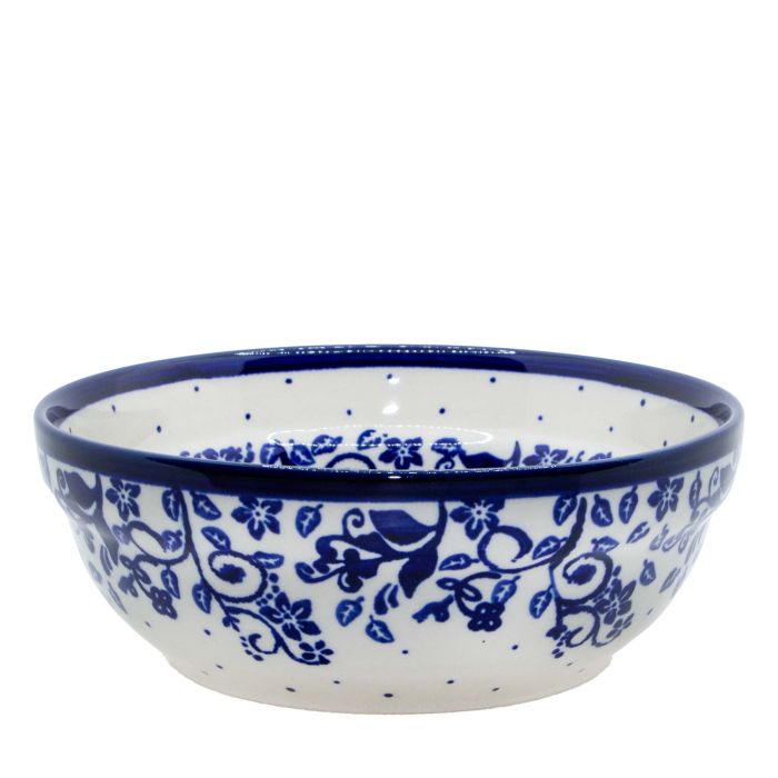 D-1324AKobaltowa dekoracja, tym razem w wersji roślinnej, to wzór dla pasjonatów granatowego koloru, związanego z tradycją ceramiki bolesławieckiej. Wijące się gałązki z kwiatami i liśćmi umieszczone zostały przez autorkę Adrianę Dudnik-Chelalga na brzegach ceramicznych naczyń. Środkowa część talerzy, misek czy półmisków oraz dolna część kubków, dzbanków, czajników czy filiżanek pokryta jest drobnymi, granatowymi kropkami. Taka kompozycja wzoru D-1324A nadaje naczyniom lekkości, a serwowane dania, nie zasłaniają malowanych wzorów.