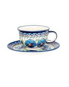 • Podobnie jak cała oferta produktów Zakładów Ceramicznych "BOLESŁAWIEC", kubki są także dekorowane ręcznie, przy użyciu stempli i pędzli, dzięki czemu każdy z nich jest unikalny, a więc mogą wystąpić minimalne różnice w dekoracji między poszczególnymi egzemplarzami w ramach tej samej dekoracjiART-277To jedna z unikatowych dekoracji, które charakteryzują się większą różnorodnością wzorów i kolorów niż tradycyjne dekoracje. W tym przypadku mamy do czynienia z jednym z najpiękniejszych polskich kwiatów, czyli bratkami. Zachowane w kolorach ciemnego niebieskiego z czarnymi środkami są eleganckie. W kontraście do prawdziwie malarskiego motywu kwiatowego są szkice składające się z abstrakcyjnych wzorów. Nietypowa dekoracja dla koneserów ceramiki Bolesławca.