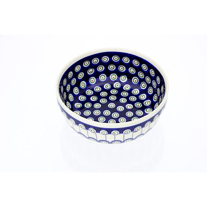 • Podobnie jak cała oferta produktów Zakładów Ceramicznych "BOLESŁAWIEC", kubki są także dekorowane ręcznie, przy użyciu stempli i pędzli, dzięki czemu każdy z nich jest unikalny, a więc mogą wystąpić minimalne różnice w dekoracji między poszczególnymi egzemplarzami w ramach tej samej dekoracjiD-8Pawie Oczka to jedna z najbardziej lubianych dekoracji bolesławieckiej ceramiki. „Pawie oczka” nawiązują do tradycyjnych motywów dekoracyjnych, wśród których przeważały oczka w trzech kolorach: kobaltu, zieleni i brązu. Kółka, kreski, kremowe tło – to wszystko sprawia, że naczynia wyglądają lekko i elegancko.