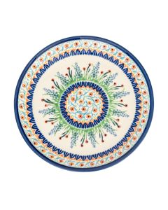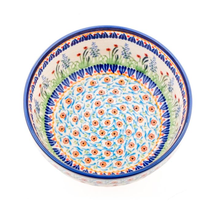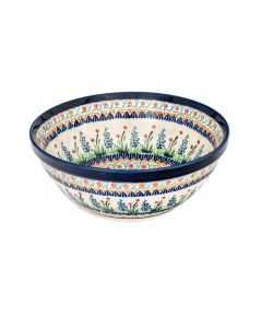 • Podobnie jak cała oferta produktów Zakładów Ceramicznych "BOLESŁAWIEC", miski są również ręcznie dekorowane za pomocą stempli i pędzli, dzięki czemu każda jest unikatowa, dlatego mogą występować minimalne różnice w dekoracji między poszczególnymi egzemplarzami tego samego wzoru.DU-155To jedna z unikatowych dekoracji, charakteryzujących się większą różnorodnością wzorów i kolorów niż tradycyjne motywy. Tutaj mamy motyw kwiatowy, florystyczny. Trzy rodzaje kwiatów, liście, trawa. Układ pokazuje, że bardziej przypomina ogród niż łąkę. Szczególnie że widzimy szałwii i "przeszkody" starannie stemplowanych abstrakcyjnych wzorów. Nie brakuje również kolorów: jest kobalt, zieleń, błękit, czerwień, żółty. Ceramika z taką dekoracją stanowi piękną dekorację stołu.