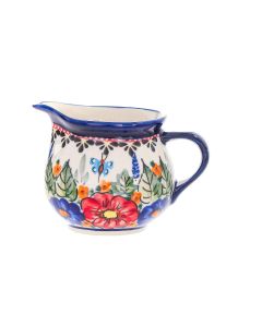 • Podobnie jak cała oferta produktów Zakładów Ceramicznych "BOLESŁAWIEC", kubki są także dekorowane ręcznie, przy użyciu stempli i pędzli, dzięki czemu każdy z nich jest unikalny, a więc mogą wystąpić minimalne różnice w dekoracji między poszczególnymi egzemplarzami w ramach tej samej dekoracjiART-149To jedna z unikatowych dekoracji, które charakteryzują się większą różnorodnością wzorów i kolorów niż tradycyjne dekoracje. W tym przypadku mamy motyw łąki kwiatowej lub ogrodu, po którym latają motyle przyciągnięte przez kwiaty. Użyte kolory to: kobalt, czerwony, pomarańczowy, odcienie zieleni, niebieski i brązowy. W kontraście do prawdziwie malarskiego motywu kwiatowego są szablony składające się z abstrakcyjnych wzorów. Bardzo spektakularna dekoracja.